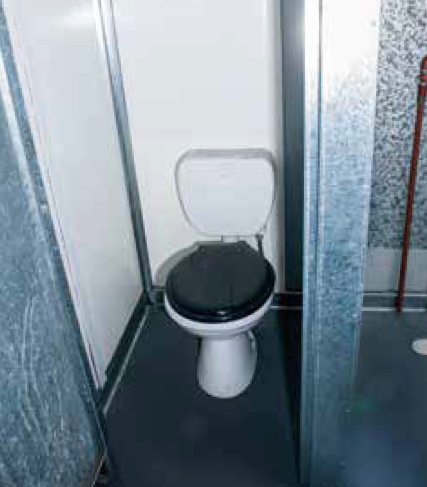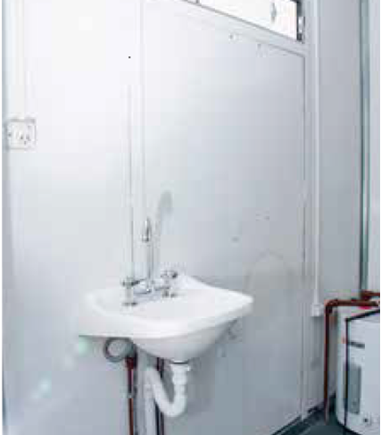 Módulo metálico portátil de 2.30 x 2.30 x 2.30 mts, con estructura de piso compuesta por un emparrillado metálico de perfil estructural de 2.0 mm de espesor. El piso de multilaminado fenólico de 18mm (Piso de goma de alto tránsito). Revestimiento exterior en paneles de chapa prepintada blanca.